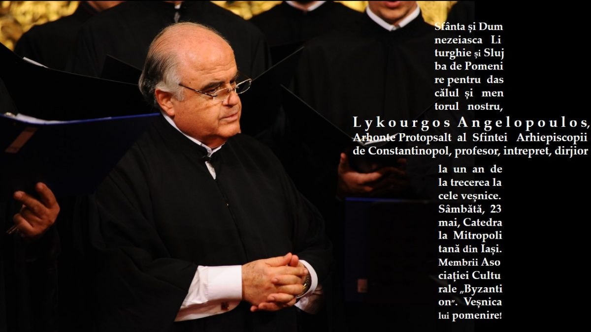 pomenire lykourgosSâmbătă, 23 mai 2015, începând cu ora 9.00, la Catedrala Mitropolitană din Iași se va săvârși Sfânta Liturghie urmată de slujba Parastasului, spre pomenirea Arhontelui Protopsalt Lykourgos Angelopoulos, la un an de la trecerea la cele veșnice. Răspunsurile la strană vor fi date de membrii Corului Academic „Byzantion”, în semn de recunoștință și datorie morală față de această personalitate culturală care nu doar a marcat evoluția acestui cor ci a contribuit, în mod definitoriu, la revigorarea artei psaltice în România.